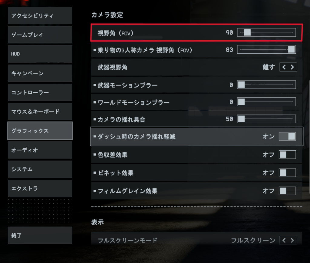 グラフィックス → カメラ設定 → 視野角